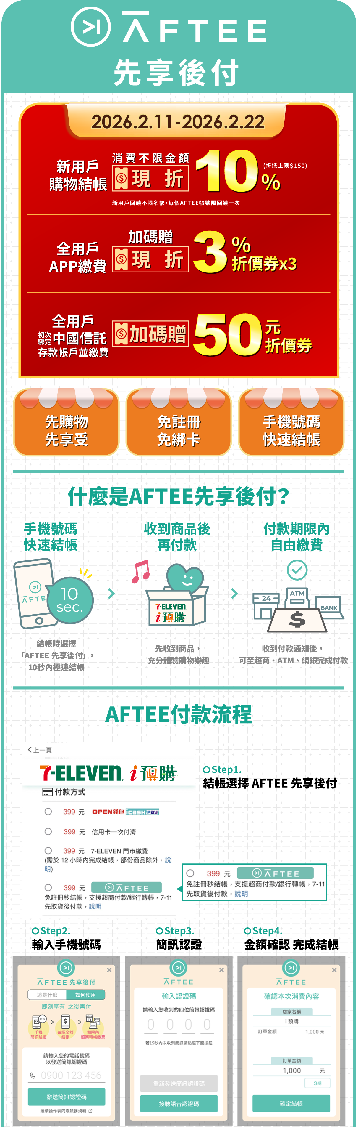 - 活動說明:活動期間內,凡AFTEE新用戶於【 7-ELEVEN i預購/i划算 】消費不限金額,並使用【AFTEE先享後付】結帳,即可享實際消費金額10%現折回饋,單筆訂單現折回饋上限150元。新用戶回饋不限名額。每個AFTEE帳號限回饋一次。