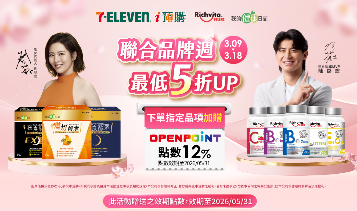 - 2026/3/9-3/18利捷維/我的健康日記 聯合品牌週OPEN POINT點數回饋12%計算方式:於本活動時間2026/3/9 00:00~2026/3/18 23:59購買7-ELEVEN i預購活動頁標示有2026/3/9-3/18利捷維/我的健康日記聯合品牌週優惠活動之指定商品,並於7-ELEVEN i預購網站(含i划算線上付)完成訂單金額結帳,即可獲得商品實付金額之12% OPENPOINT點數回饋。同筆訂單商品全數到貨後(扣除退貨),於取貨後14天回饋至帳戶。點數效期使用期限發放日起使用至2026/05/31為止,逾期未使用不予補發。