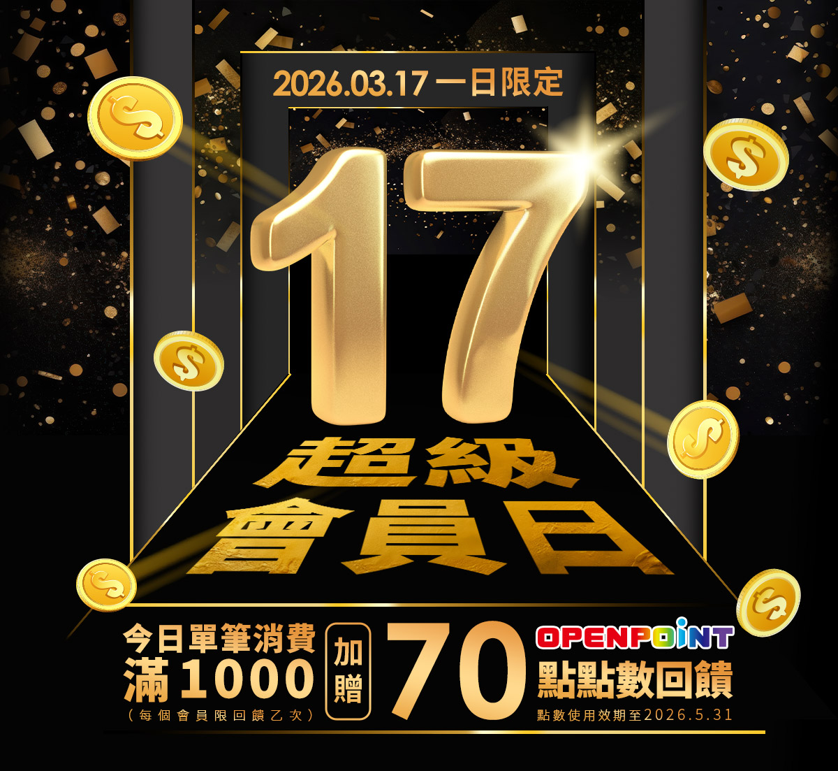 活動期間內,全站單筆實際消費滿$1,000享70點OPENPOINT點數回饋。(每一會員帳號限回饋乙次,上限70點)。本活動之加碼點數於取貨後14天回饋,使用期限至2026/5/31為止,逾期未使用不予補發。