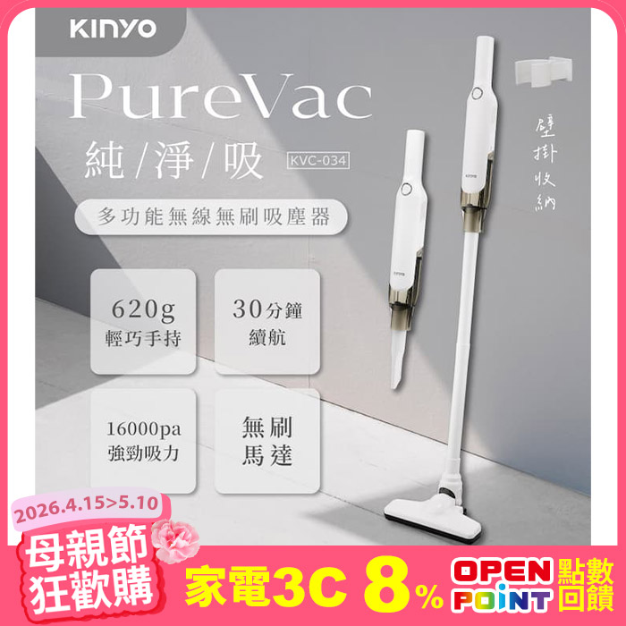 PureVac 純淨吸 ‧ 多功能無線無刷吸塵器 KVC-034標準/強勁 模式原價$1,980特價$1,380