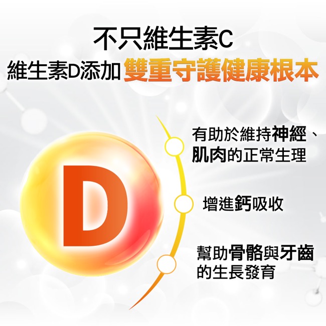 食品添加物:抗壞血酸鈉(維生素C)、抗壞血酸(維生素C)、硬脂酸鎂、二氧化矽、磷酸氫鈣(無水)、蔗糖素(甜味劑)、維生素D3[辛烯基丁二酸鈉澱粉、蔗糖、抗壞血酸鈉(抗氧化劑)、中鏈三酸甘油酯、二氧化矽、DL-α-生育醇(抗氧化劑)、膽鈣化醇(維生素D3)]、β-胡蘿蔔素[葵花油、阿拉伯膠、麥芽糊精、蔗糖、水、β-胡蘿蔔素、L-抗壞血酸棕櫚酸酯(抗氧化劑)、混合濃縮生育醇(抗氧化劑)]、檸檬香料(香料、天然香料、酒精、水)、D-木糖醇(甜味劑)。
