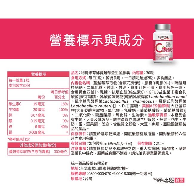 | 商品名稱 | 利捷維有酵蔓越莓益生菌膠囊 30粒 |