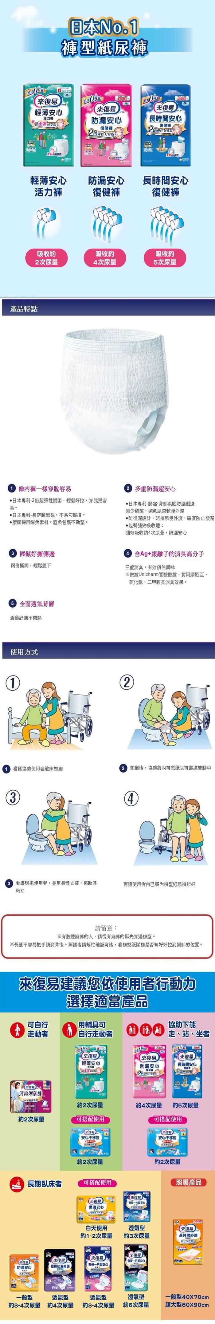 | 包裝內容/商品規格 | 來復易 輕薄安心活力褲(M)(18片 X 4包/箱) |