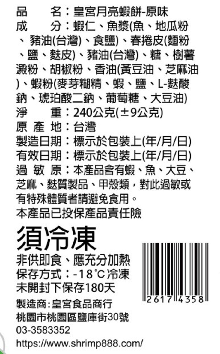 | 商品名稱 | 【皇宮】月亮蝦餅-原味(240g)10片 |