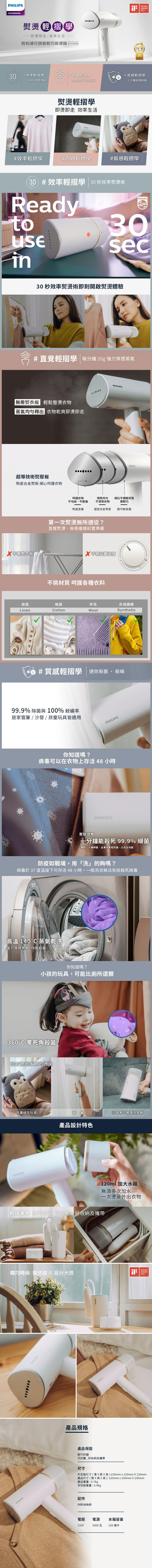 | 商品名稱 | 【PHILIPS 飛利浦】 STH3020 手持式蒸氣掛燙機-白金 |