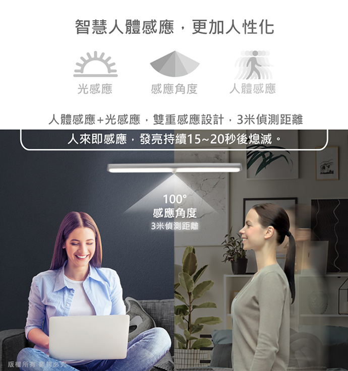 ◆雙感應亮燈設計:人體感應+光感應(100度廣角,3米距離)