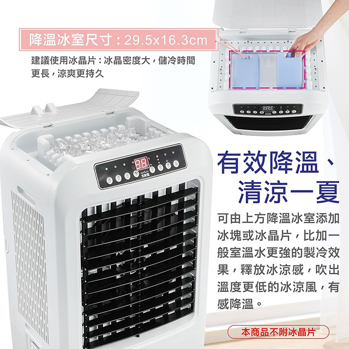 1.可由上方添加冰塊,使用冰塊或冰晶片,產生溫度更低的風