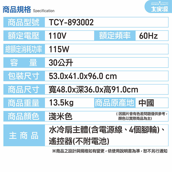 | 商品名稱 | 大家源 30L分離式冰涼水冷扇 TCY-893002 |