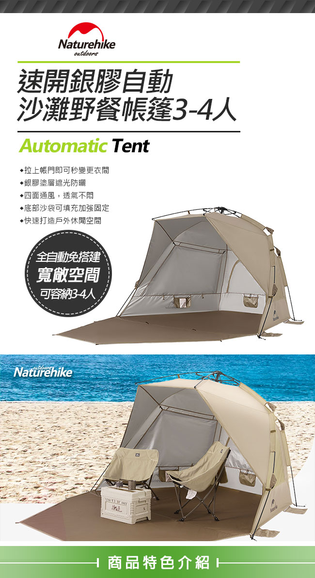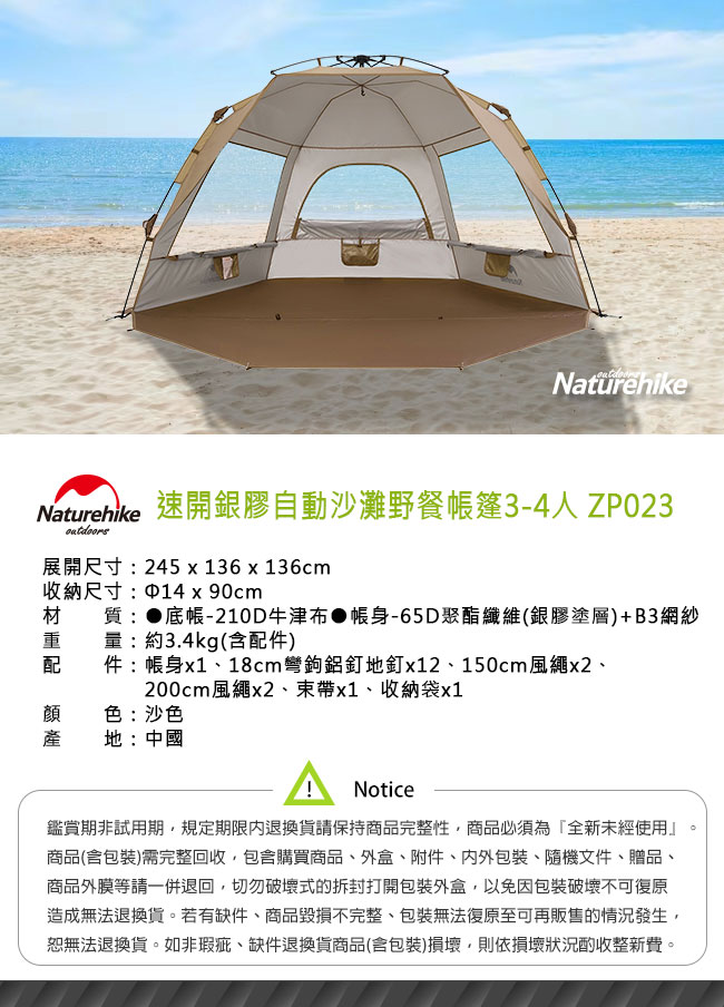 | 【商品名稱或型號】 | 【Naturehike】速開銀膠自動沙灘野餐帳篷3-4人 ZP023 |