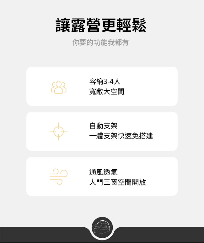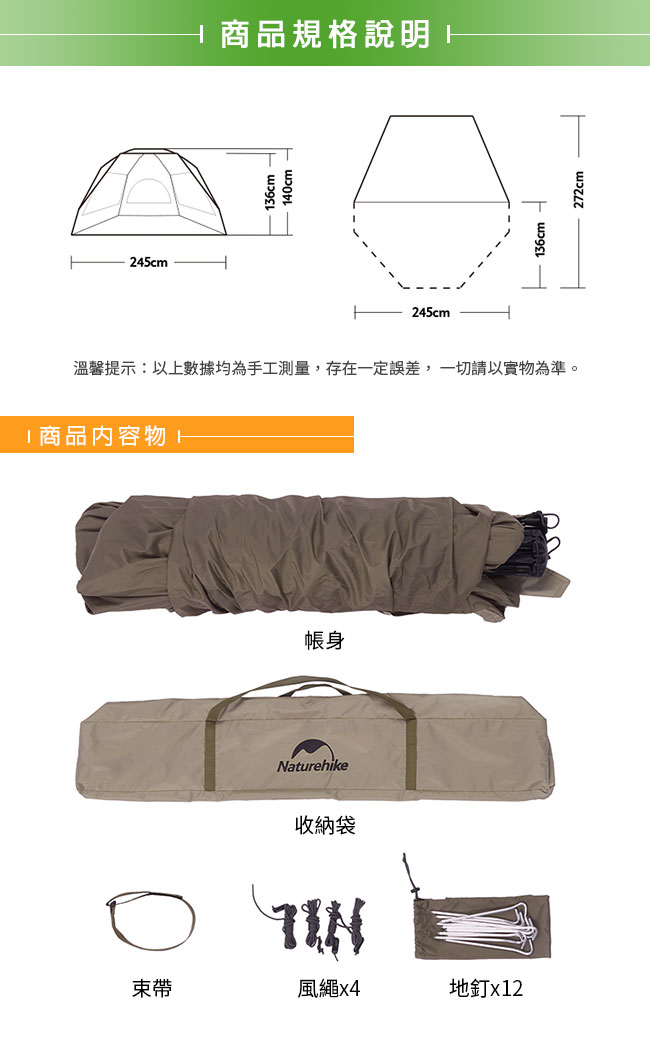 | 【材質或成分】 | ●底帳-210D牛津布●帳身-210T聚酯纖維牛津布(銀膠塗層)●B3網紗 |