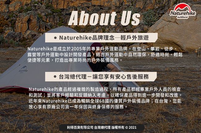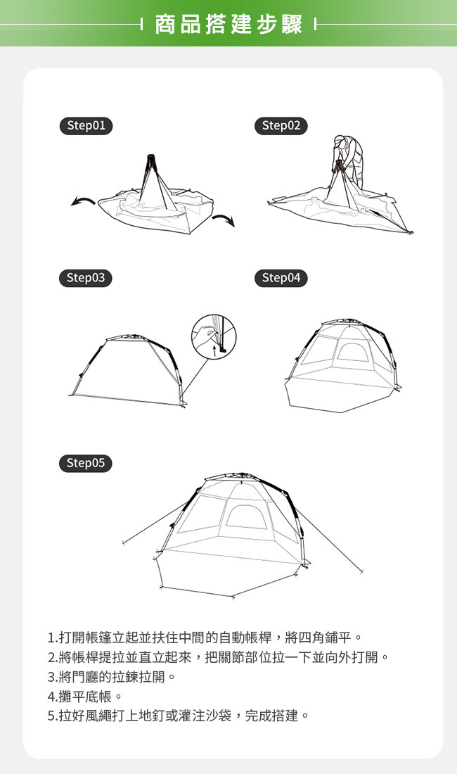 | 【內容物】 | 帳篷x1、18cm彎鉤鋁釘地釘x12、150cm風繩x2、200cm風繩x2、束帶x1、收納袋x1 |