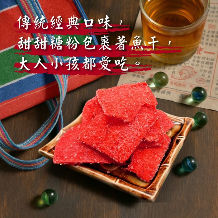 傳統經典口味,甜甜糖粉包裹著魚干,大人小孩都愛吃。