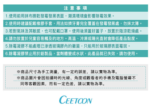 1.使用前用抹布擦乾沒發黑表面,潮濕環境會影響除霉效果。 2.使用時建議配戴橡膠手套,用法如擠牙膏完全覆蓋在發霉發黑處,勿抹太薄。 3.若對氣味極其敏感,也可配戴口罩,使用後須蓋好蓋子,放置於陰涼乾燥處。 4.請勿放置於兒童容易觸及的地方。高溫、冷凍或陽光直射會降低產品黏度。 5.除霉凝膠不能處理已滲透玻璃膠內的黴菌,只能用於玻璃膠表面霉斑。 6.除霉凝膠禁止用於鋁製品,當劑體變成水狀,此產品就已失效,請勿使用。 |