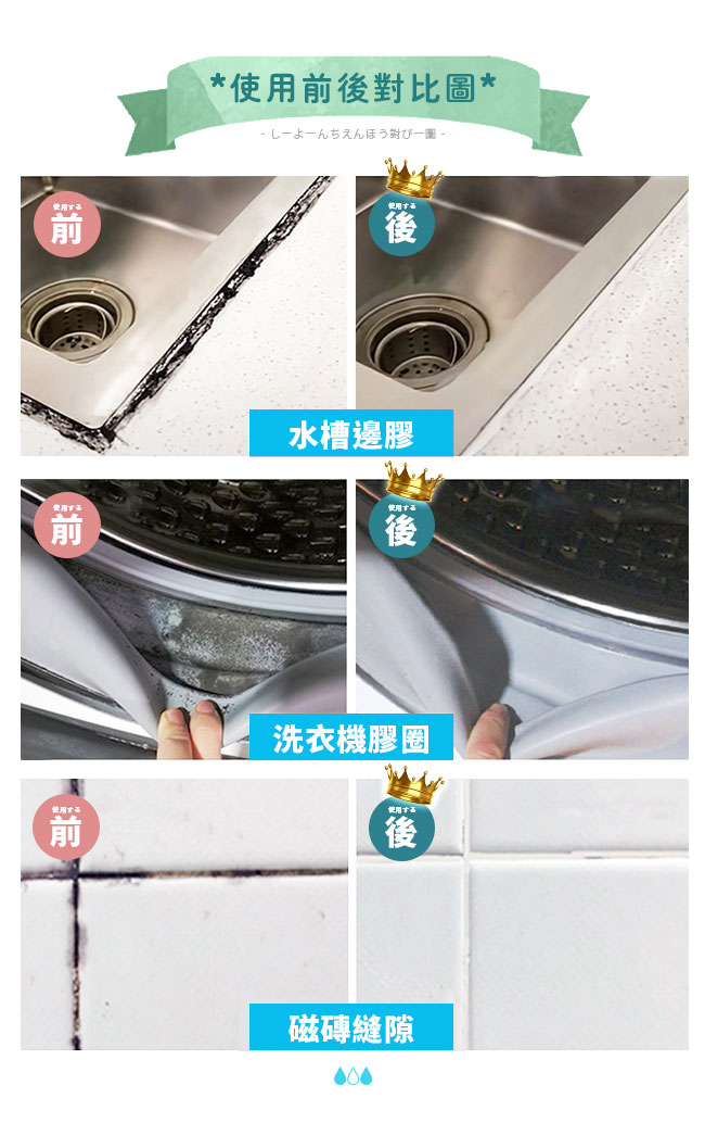 | 用途 | 用於浴室、廚房水槽、窗框、洗衣機槽膠圈、冰箱內部、磁磚表面、接口隙縫處等,因潮濕而產生的霉菌污垢,防止霉菌附著 |