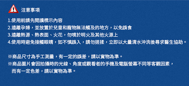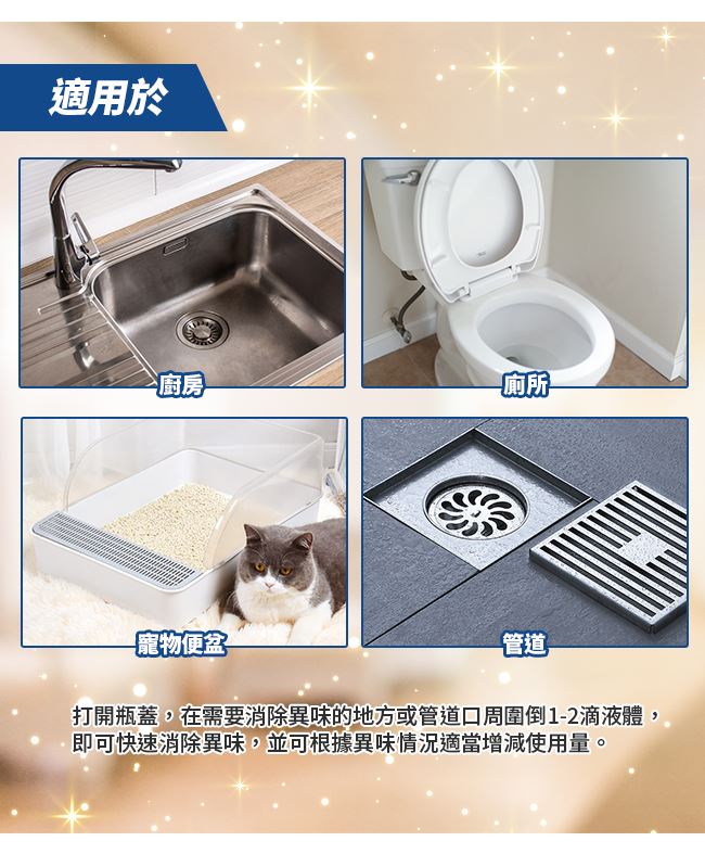 | 使用方法 | 打開瓶蓋,在需要消除異味的地方或管道口周圍倒1-2滴液體,即可快速消除異味,並可根據異味情況適當增減使用量。 |