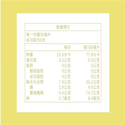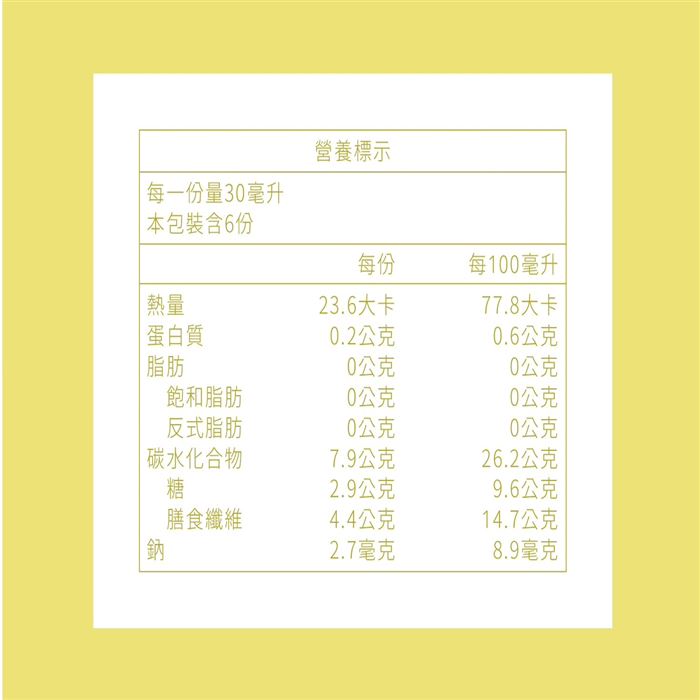 | 內容物 (完整成份/食品添加物) | 植萃液(水、枸杞、人蔘、杜仲)、難消化性麥芽糊精(Fibersol-2)、鳳梨濃縮汁、柳橙濃縮汁、蔬果醱酵液 ( 菠菜、萵苣、葡萄、黃瓜、蓮霧、木薯、小松菜、銀耳、山藥、番茄、南瓜、甘藍、梅子、番薯、 花椰菜、檸檬、鳳梨、小白菜、哈密瓜、芹菜、生薑、木瓜、芥菜、冬瓜、蘆筍、芥藍、黃豆、西 瓜、金桔、青椒、青江菜、隼人瓜、薏仁、瓠瓜、蕪菁、蘋果、楊桃、青花菜、葡萄柚、馬鈴薯、 蘿蔔、水梨、甜瓜、甜椒、苦瓜、胡蘿蔔、番石榴、空心菜、番薯葉、絲瓜、印度棗、酪梨、釋迦、 紅鳳菜、諾麗果、黑木耳、豆瓣菜、枇杷、百香果、甜菜根、櫻桃、豌豆、菜豆、芋頭、紅豆、玉 米、草莓、柿子、甘蔗、奇異果、李子、蓮子、金針菇、香菇、茼蒿、芒果、桑葚、白菜、火龍果、 藍莓、柳橙、柑橘、牛蒡、龍眼、茄子、蓮藕、荔枝、紫蘇)、百香果原汁、檸檬原汁、蒟蒻粉、 大麥草粉、玉米鬚萃取物(玉米鬚萃取物、麥芽糊精)、南瓜籽萃取物(南瓜籽萃取物、麥芽糊精)、 薑黃萃取物、鳳梨酵素(麥芽糊精、鳳梨酵素)、牛乳清蛋白、綠色奇異果粉(綠色奇異果粉、微結晶 狀α-纖維素、二氧化矽)、檸檬馬鞭草萃取物(檸檬馬鞭草萃取物、糊精)、甜橙萃取物、蔬果萃取 粉(麥芽糊精、地瓜、蘿蔔、櫻桃、蘋果、水、檸檬酸)、植物萃取粉(麥芽糊精、胡蘿蔔、洛神、水、 檸檬酸)。 |