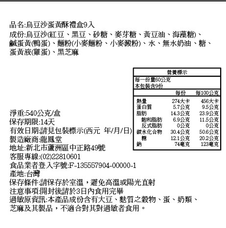 | 商品名稱 | 【龍鳳堂】冠軍烏豆沙蛋黃酥禮盒10盒(9入/盒) |