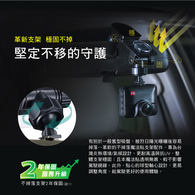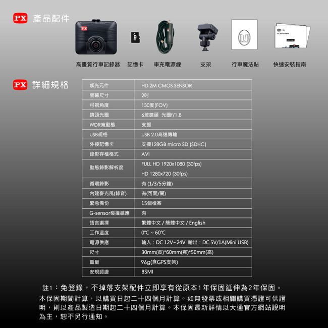 包裝內容物:高畫質行車記錄器x1,車充電源線x1,魔法貼x1,GPS支架配件x1,記憶卡x1,快速安裝指南x1保固:全機2年保固(魔法貼配件2年保固,其餘配件1年保固)