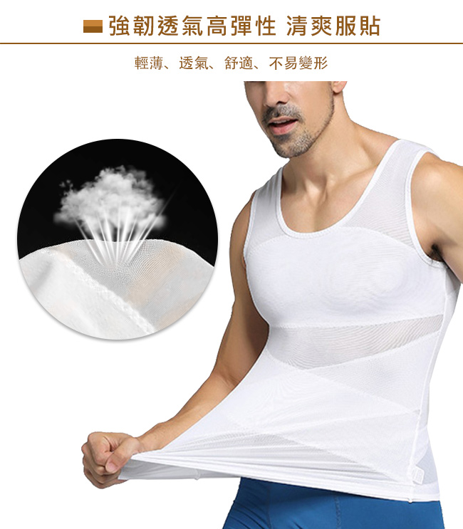 【商品名稱】【Charmen】菱形加壓彈力網紗收腹透氣背心 男性塑身衣(白色M)