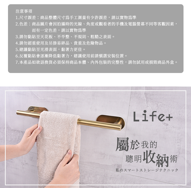 | 注意事項 | ■尺寸誤差:商品整體尺寸為手工測量有少許誤差,請以實物為準 ■色差:商品圖片會因拍攝時的光線、角度或觀看者的手機及電腦螢幕不同等客觀因素,而有一定色差,請以實物為準 ■請勿黏貼至天花板、不平整、不規則、粗糙之表面。 ■請勿超重使用及吊掛易碎品、貴重及危險物品。 ■建議黏貼至光滑表面,黏著力更佳。 ■反覆黏貼會逐漸降低黏著力,建議使用前請慎選安裝位置。 ■本產品如欲退換貨必須保持商品本體、內外包裝的完整性,請勿試用或損毀商品外盒。 |