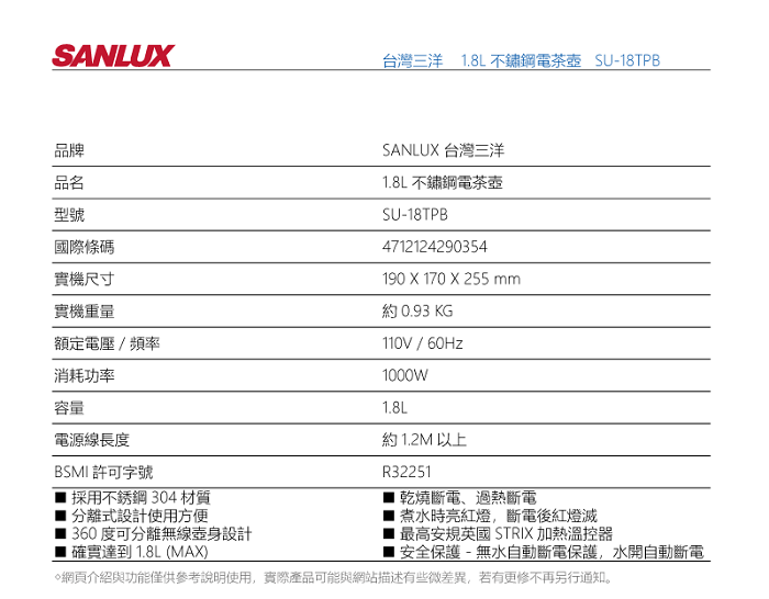 | 商品名稱 | SANLUX 台灣三洋 1.8L不鏽鋼電茶壺SU-18TPB |