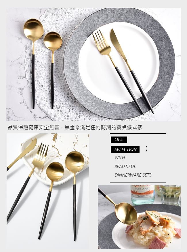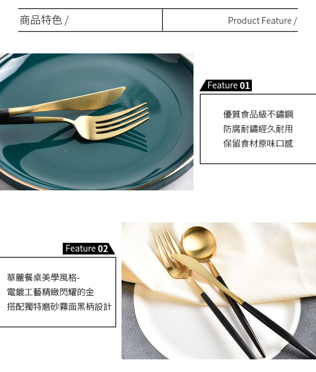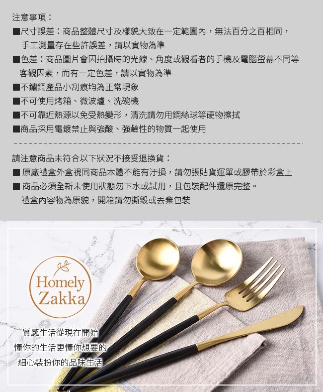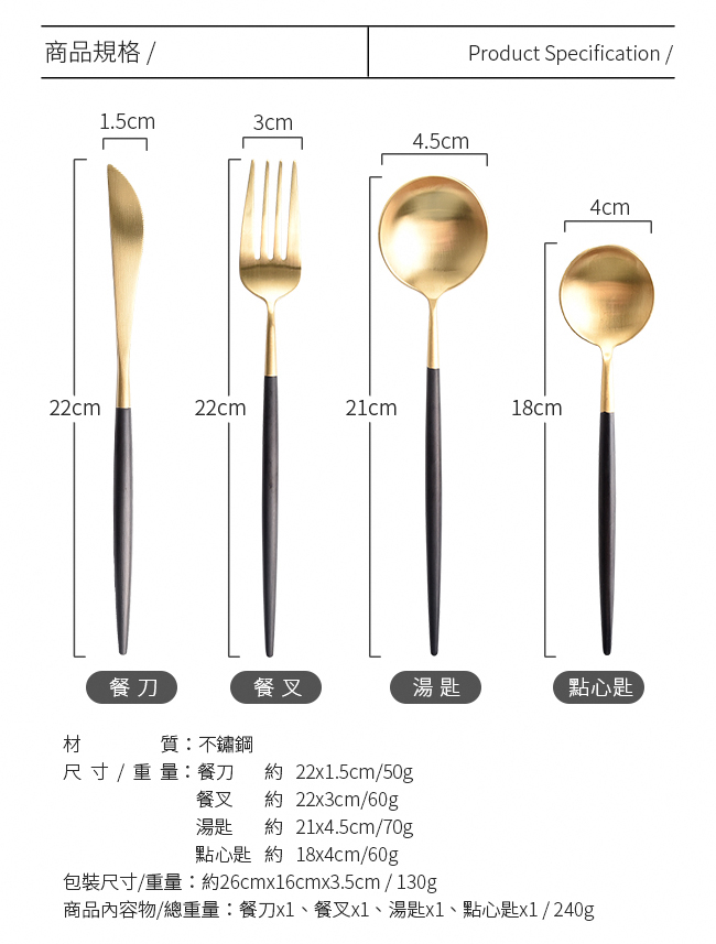 | 包裝內容/商品規格 | 尺寸/重量: 餐刀 約22x1.5cm/50g 餐叉 約22x3cm/60g 湯匙 約21x4.5cm/70g 甜點勺 約18x4cm/60g |