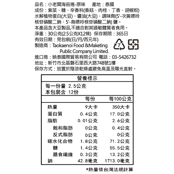 | 包裝內容/商品規格 | 泰國小老板BIG ROLL烤脆紫菜卷海苔卷-原味 15包組(2.5g*12條/包) |