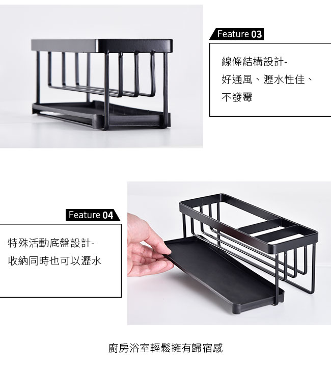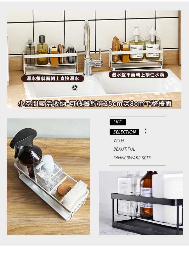 | 包裝內容/商品規格 | 顏色:黑色、白色 尺寸/重量: 置物架 約 25cmX9cmX9.6cm/466g 瀝水盤 約 24cmX9cmX1.5cm/30g 包裝尺寸/重量: 約26cmX10.5cmX10.5cm/80g |