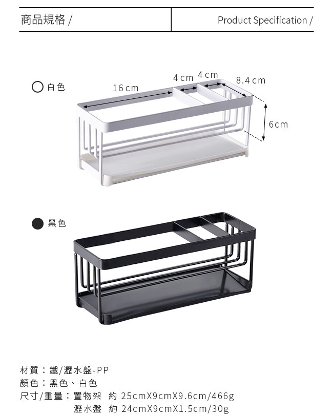 | 包裝內容/商品規格 | 顏色:黑色、白色 尺寸/重量: 置物架 約 25cmX9cmX9.6cm/466g 瀝水盤 約 24cmX9cmX1.5cm/30g 包裝尺寸/重量: 約26cmX10.5cmX10.5cm/80g |