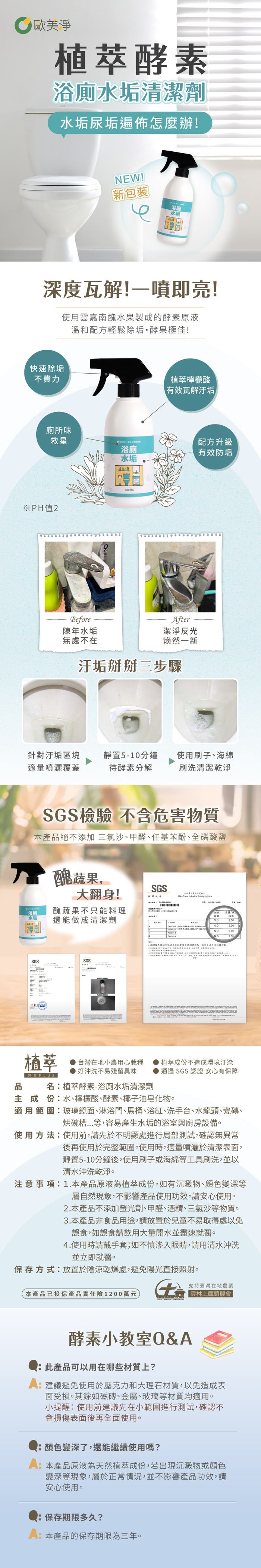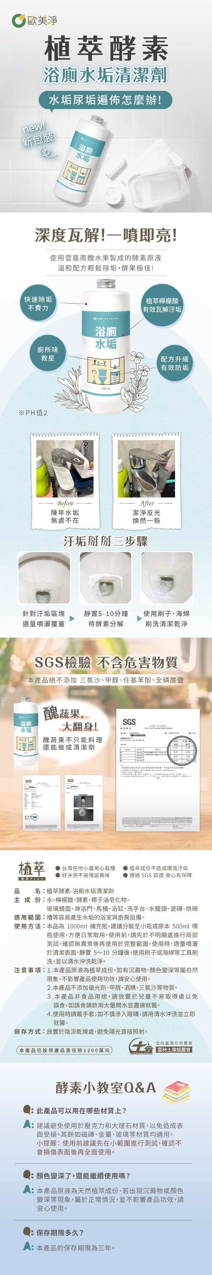 | 商品名稱 | 【歐美淨】浴廁組|植萃酵素清潔劑(水垢500ml+1000ml+除霉500ml) |