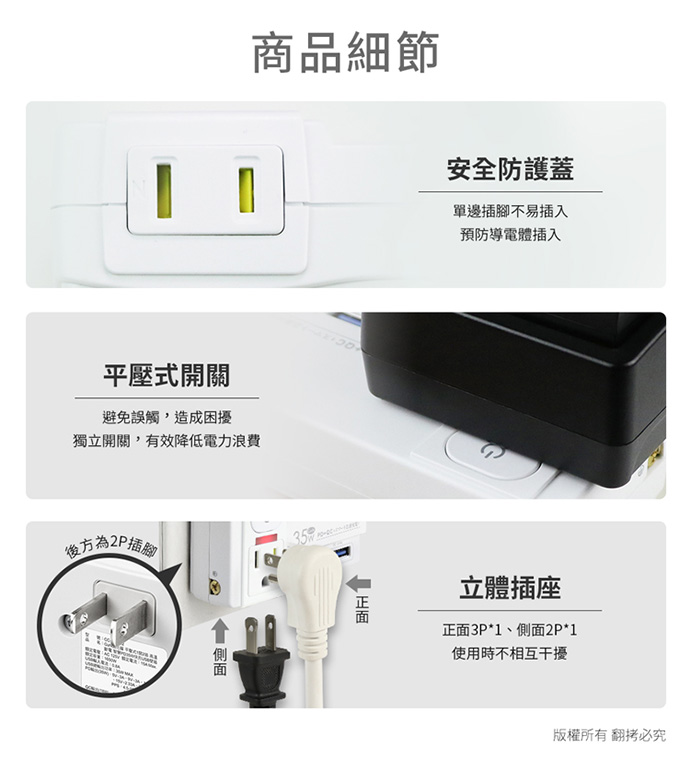 ◆插座採用PC防火材質,堅固、強韌、不易燃燒!