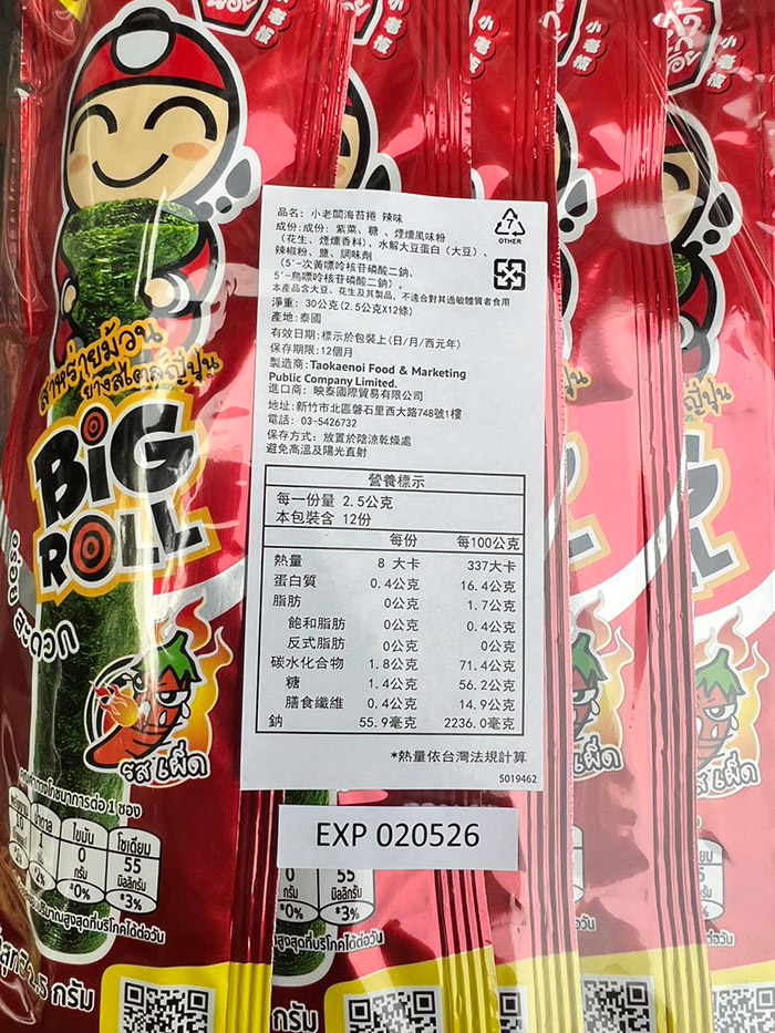 | 包裝內容/商品規格 | 泰國小老板BIG ROLL烤脆紫菜卷海苔卷-辣味 15包組(2.5g*12條/包) |