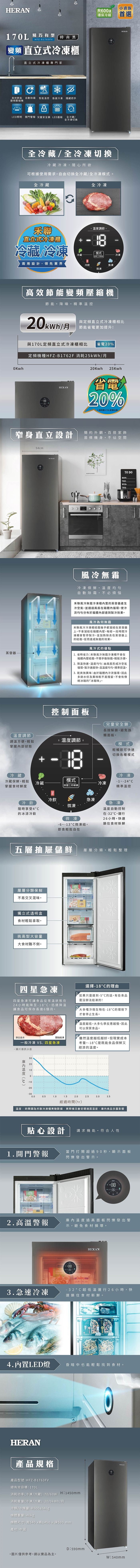 | 商品名稱 | 【HERAN禾聯】170L變頻 風冷無霜直立式冷凍櫃 HFZ-B1763FV |