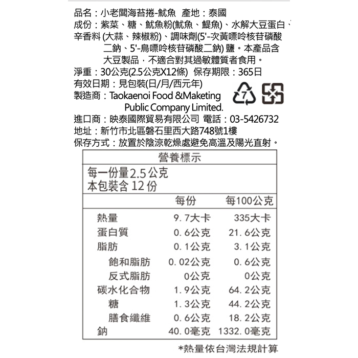 | 內容物(完整成份/食品添加物) | 紫菜、糖、魷魚粉(魷魚 、鯷魚)、調味料(醬油、糖、蒜粉、辣椒粉、魚露)、水解大豆蛋白 |
