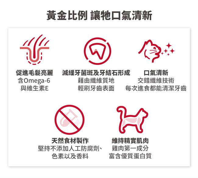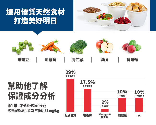 | 內容物 (完整成份/食品添加物) | 雞肉、糙米、玉米筋質粉、雞肉脂肪、纖維素粉、小麥筋質、雞肉粉、亞麻仁籽、雞肝香料、乳酸、氯化鉀、硫酸鈣、氯化膽鹼、左旋離胺酸、碘鹽、牛磺酸、維生素(維生素E添加劑、抗壞血酸多聚磷酸酯(維生素C來源)、菸鹼酸添加劑、維生素B1、泛酸鈣、維生素B6、維生素A添加劑、核黃素添加劑、生物素、維生素B12添加劑、葉酸、維生素D3添加劑)、礦物質(硫酸亞鐵、氧化鋅、硫酸銅、氧化錳、碘酸鈣、亞硒酸鈉)、DL-蛋胺酸、燕麥纖維、添加綜合維生素E類以保鮮、天然香料、β-胡蘿蔔素、蘋果、青花菜、胡蘿蔔、蔓越莓、綠豌豆 | |