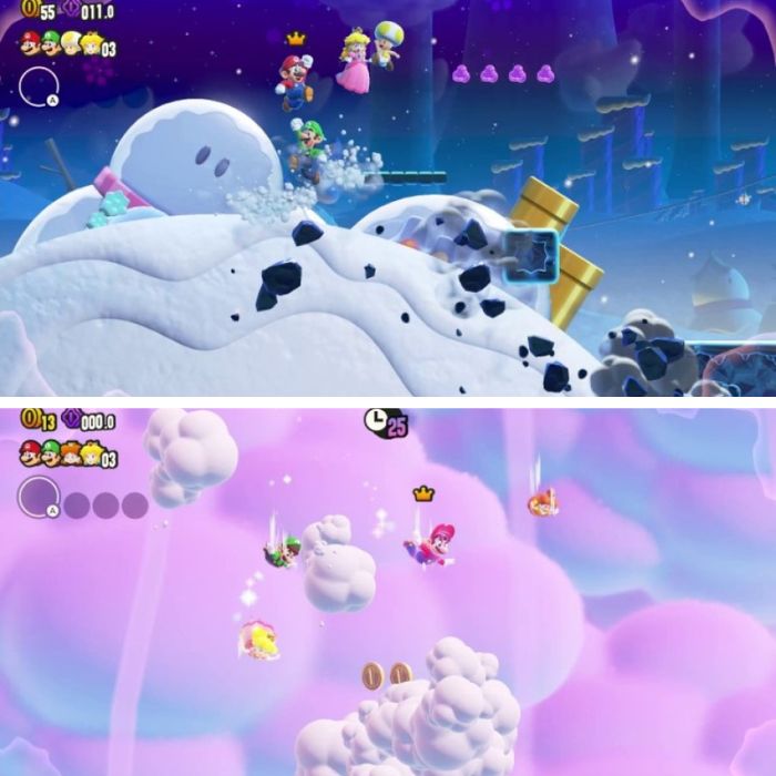瑪利歐與同伴們一邊突破重重敵人和機關,一邊以終點旗杆為目標長驅直進。
