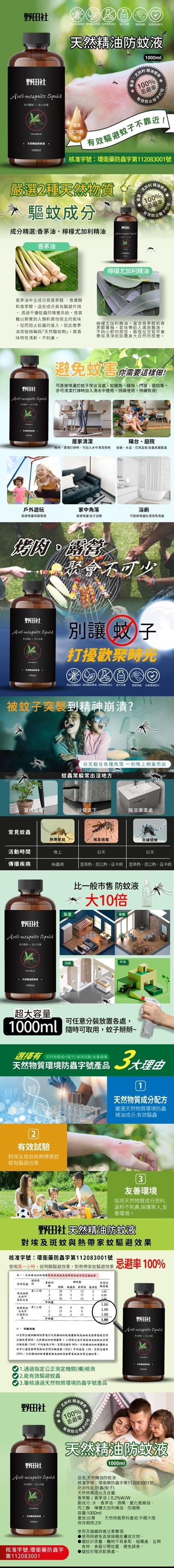 | 內容物 | 野田社天然精油防蚊液補充瓶1000ml |