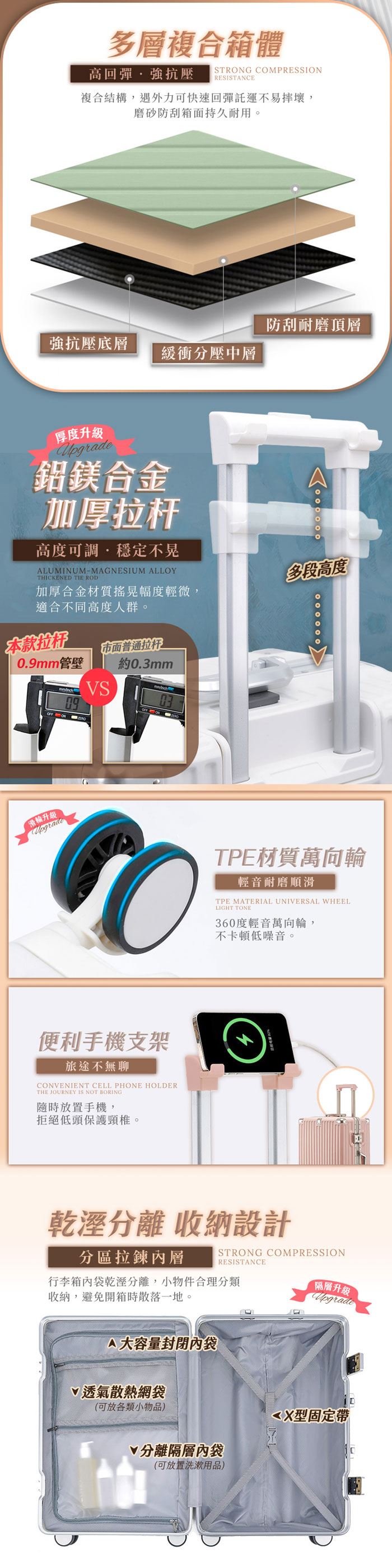 | 注意事項 | 1.本產品不適合14歲以下者使用。 2.不可盛裝易燃物。 3.請勿接觸高溫物體或接近火源。 4.請勿於箱體內收納總重超過標示乘載重量之物體。 5.行李箱攜帶或託運內容物請參考民航局公告規定。 |