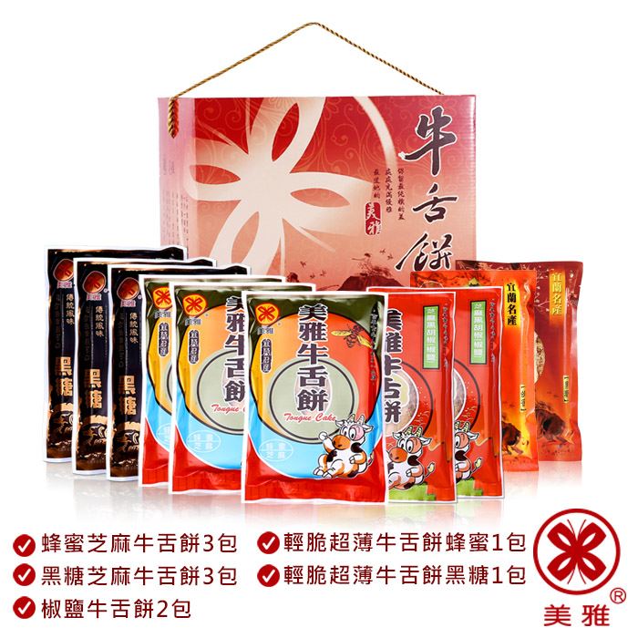 | 包裝內容/商品規格 | 蜂蜜芝麻牛舌餅 淨重:77g/包,3包入 黑糖芝麻牛舌餅 淨重:77g/包,3包入 椒鹽牛舌餅 淨重:77g/包,2包入 輕脆超薄-蜂蜜 淨重:75g/包,1包 輕脆超薄-黑糖 淨重:75g/包,1包 |