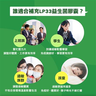 原料:LP33®菌粉Lactobacillus paracasei 33、葡萄糖、玉米澱粉、麥芽糊精、LGG菌粉Lactobacillus rhamnosus GG、副乾酪桿菌菌粉Lactobacillus paracasei subsp. paracasei、嗜酸乳桿菌NCFM菌粉Lactobacillus acidophilus NCFM、果寡醣、硬脂酸鎂。 膠囊成分:明膠、硫酸月桂酯鈉。 |