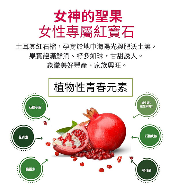 含有女性青春神秘元素鞣花酸、石榴多酚、花青素等多種營養素。