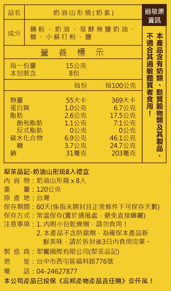 | 包裝內容/商品規格 | 奶油山形燒15g x8入(6盒/箱) |