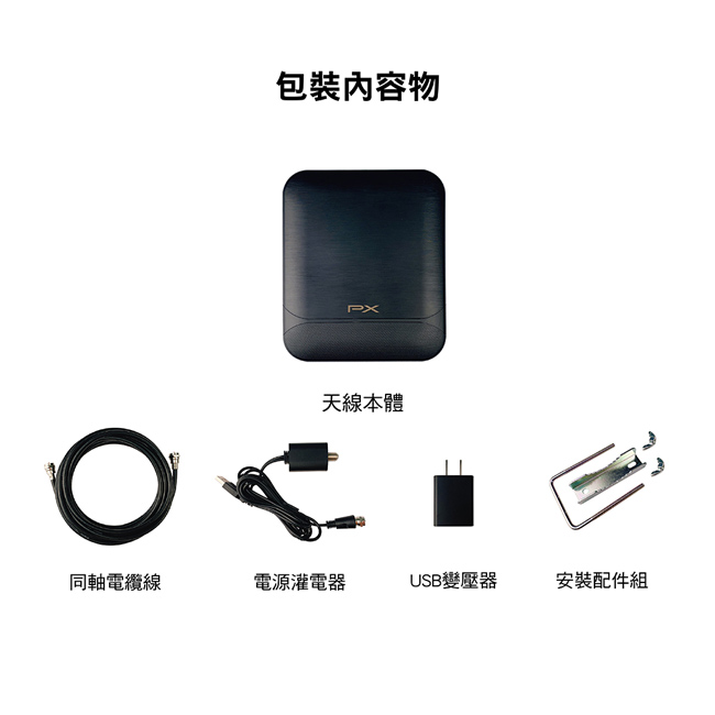 包裝內容物:天線本體x1 ,3m 3C-2V同軸電纜線x1,電源灌電器x1,USB 變壓器x1