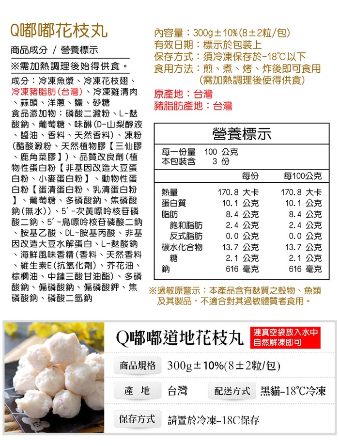 | 過敏原資訊 | 本產品含有麩質的穀物、魚類及其製品不適合其過敏體質者食用 |