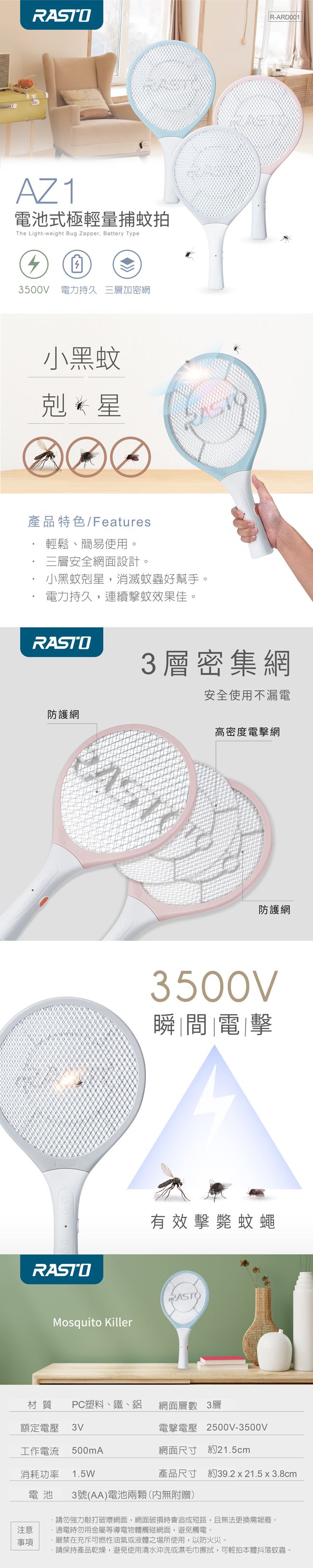 | 【包裝內容/規格】 | RASTO AZ1 電池式極輕量捕蚊拍 |