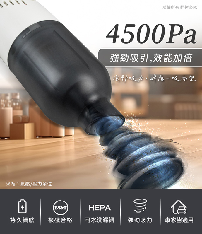 --4500Pa大吸力,搭配可水洗HEPA濾網,除塵不費力--