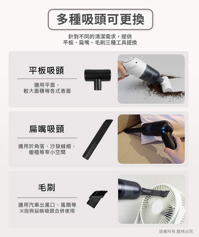 內附毛刷、扁嘴吸頭、平板吸頭,可因應不同清潔需求,