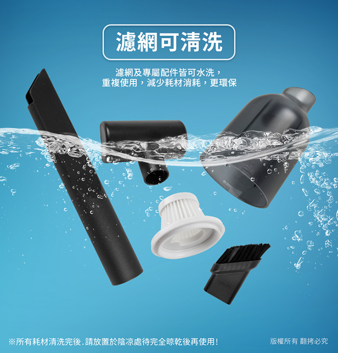 ◆吸頭配件及HEPA濾網,皆可水洗重複使用,0耗材更環保