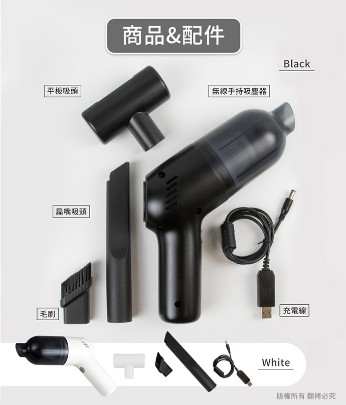 | 內容物 | 無線手持吸塵器 x1、充電線 x1、毛刷 x1、 平板吸頭 x1、扁嘴吸頭 x1、說明書 x1 |