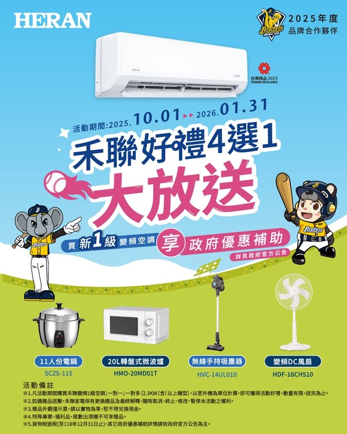 2025年10月1日起至2026年1月31日截止,禾聯空調早販活動享好禮4選1
